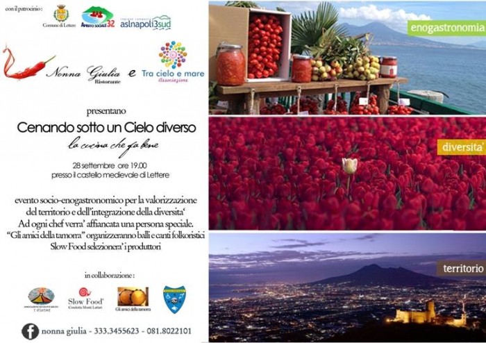 Sapori tipici, bellezza del territorio e solidarietà sono gli ingredienti di Cenando sotto un cielo diverso, , l’evento socio-enogastronomico che si tiene il 28 settembre (dalle ore 19) presso il Castello medioevale di Lettere organizzato dal Ristorante Nonna Giulia e dall’associazione Tra cielo e mare, che operano a sostegno dei giovani con disagio psichico. La serata, realizzata con il contributo dell’ associazione di volontariato I Vesuviani, attiva nel sostegno agli anziani, dell’associazione I disabili di Gragnano, impegnata nel sostegno dei non udenti, di Slow food condotta dei Monti Lattari e dell’associazione Gli amici della Tammorra, intende valorizzare il territorio, i suoi prodotti tipici ma soprattutto, attraverso la convivialità del cibo, rappresentare un momento di integrazione con chi vive una dimensione considerata “altra”. Chef di alto livello proporranno dei piatti d’eccezione aiutati da collaboratori “diversi”, giovani o anziani, che vivono delle fragilità.