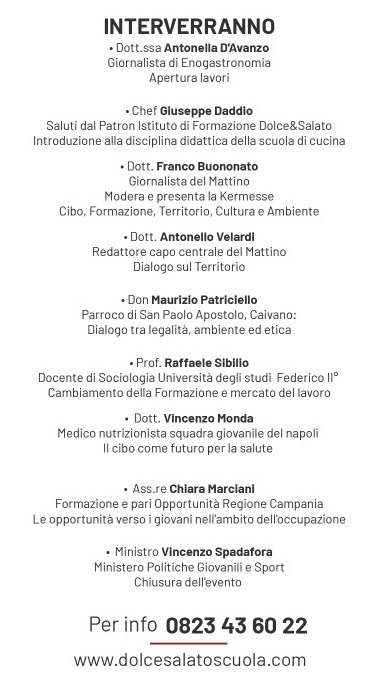 Un incontro che ha l’obiettivo di creare un confronto e un dibattito sui temi oggetto delle attività formative della scuola, dove il Ministro dialogherà insieme agli altri ospiti dell’evento: Antonello Velardi (capo redattore centrale de Il Mattino) racconterà il ‘Territorio’, Don Maurizio Patriciello (Parroco Di San Paolo Apostolo Caivano) ‘dialogo tra legalità, ambiente ed etica sociale’, Raffaele Sibilio (docente di Sociologia della Federico II°) ‘cambiamento della formazione e mercato del lavoro’, Ottavio Lucarelli (presidente dell’Ordine dei Giornalisti della Campania) ‘cultura come magnete per la conoscenza’, Vincenzo Monda (medico nutrizionista della squadra di calcio giovanile del Napoli) ‘il cibo come futuro per la salute’, Chiara Marciani (Assessore Regionale alla Formazione Pari Opportunità) ‘le opportunità verso i giovani nell’ambito dell’occupazione’. Introdurranno lo chef Giuseppe Daddio, (direttore e patron dell’Istituto di Formazione) e la giornalista enogastronomica Antonella D’Avanzo da sempre sul territorio e vicina alla Dolce & Salato. Il coordinamento dei lavori sarà affidato a Franco Buononato (giornalista de Il Mattino).