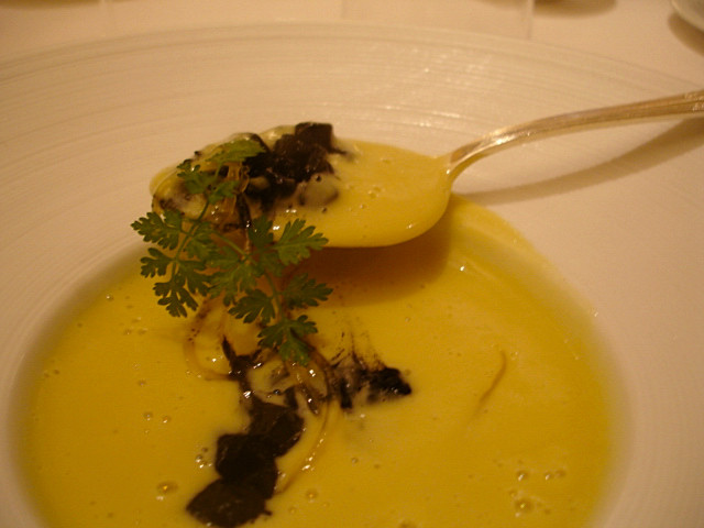 Crema di zucchette trombette con seppie al nero e scorzette di limone. Flavio Costa all'Arco Antico di Savona