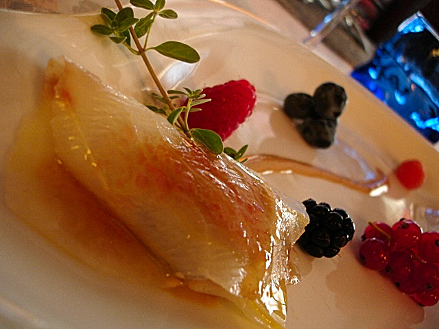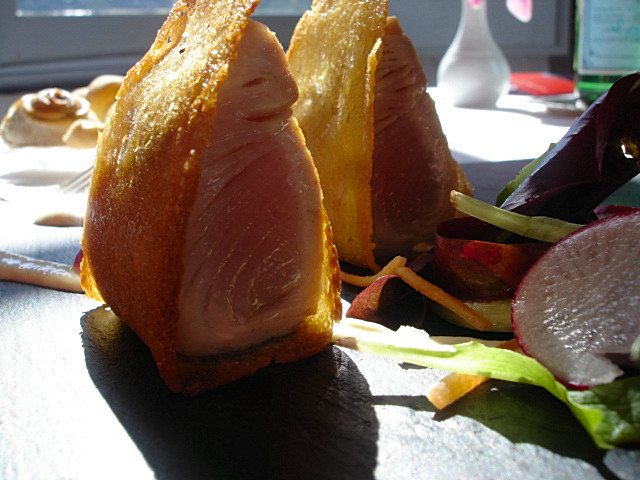 Non è vero che la cucina di Massimo Viglietti sia scollegata dal suo contesto territoriale. Certo, la foto mi smentisce, quel ripieno di fegato d’oca ha pochi legami con la Liguria, ma proiettando il pensiero a confini ampliati e includendo Provenza e basso Piemonte si potrà intendere meglio un pensiero che appare scollato dal territorio solo se si è superficiali, perchè a ben guardare nelle ricette stagionali proposte al Palma, quasi la totalità degli ingredienti utilizzati hanno un solido radicamento con il circondario, anche se poi vengono impiegati secondo un pensiero originale e personalissimo. Oggi, in questo locale , piaccia o no, è possibile nutrirsi solo di idee anticonformiste trasformate in composizioni edibili solleticanti o spiazzanti. Non per bizzarria fine a se stessa, quanto per esprimere un concetto cerebrale che si stacchi da ogni conformismo, che esca da ogni tracciato confortevole, da ogni percorso collaudato e funzionale pressoché in ogni altro locale ligure. Fatevi graffiare l’anima dalla voce di Tom Waits. O così o niente .Prendere o lasciare.
