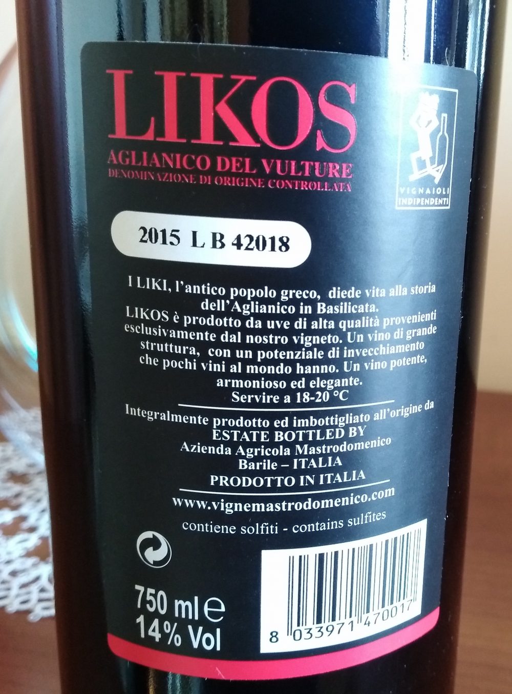 Controetichetta Likos Aglianico del Vulture Doc 2015 Mastrodomenico