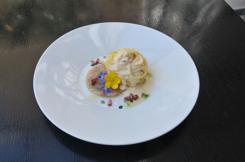 Con un coppa pasta largo adagiare la tartare di pesce preparato in precedenza con sentore di limone e aneto … adagiarvi un nido di linguine ben amalgamate e davanti al vostro ospite versare la carbonara liquida ancora tiepida e ben emulsionata completare con aneto e polvere di guanciale di pesce di scoglio (la pelle dei pesci viene fatta essiccare in forno e poi sbriciolata )