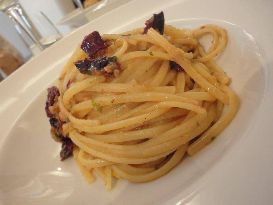 Ad un paio di minuti dalla fine della cottura delle linguine aggiungerle al condimento e spadellare per qualche minuto aggiungendo il pane aromatizzato.