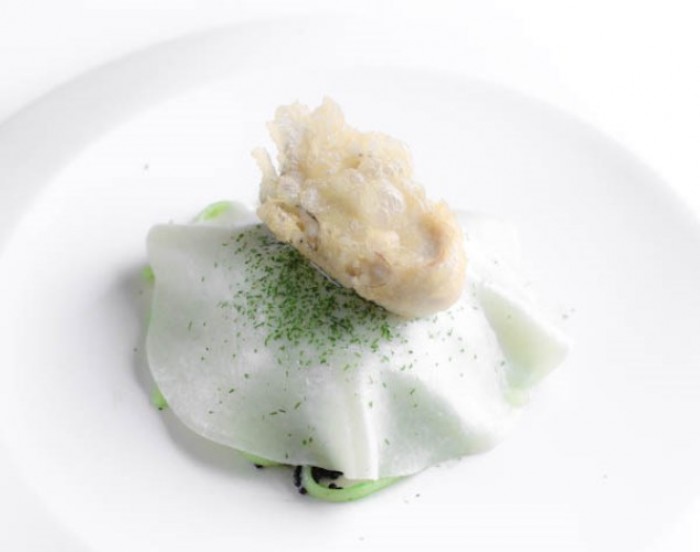 Impiattate creando dei nidi di pasta in cui andrete ad aggiungere il caviale, il velo di mozzarella scolato, della polvere di basilico disidratata e setacciata e infine l’ostrica.