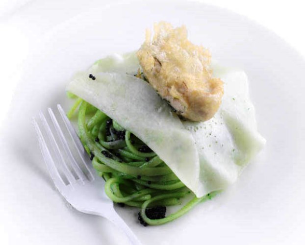 Una volta realizzati i veli, riponeteli in un contenitore lasciandoli in ammollo nella loro acqua di governo. Preparate la clorofilla frullando le foglie di basilico e cipollina in acqua molto fredda. L’acqua dovrà coprire le foglie. Filtrate e recuperate l’acqua. Con le foglie sminuzzate realizzate un condimento mettendole in infusione in abbondante olio evo.