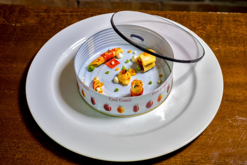 La composizione del piatto è libera. In questo caso è stata utilizzata la crema di burrata unita ad una parte di gelatina per realizzare i ripieni, dei fogli di gelatina per avvolgere la pasta e dargli colore e sapore, il caviale giallo e dei ciuffetti di crema di burrata con la crema di basilico sparsi nel piatto per dare colore e allegria al piatto. Infine è stata cosparsa la pasta con una spruzzata di polverina di pomodoro.