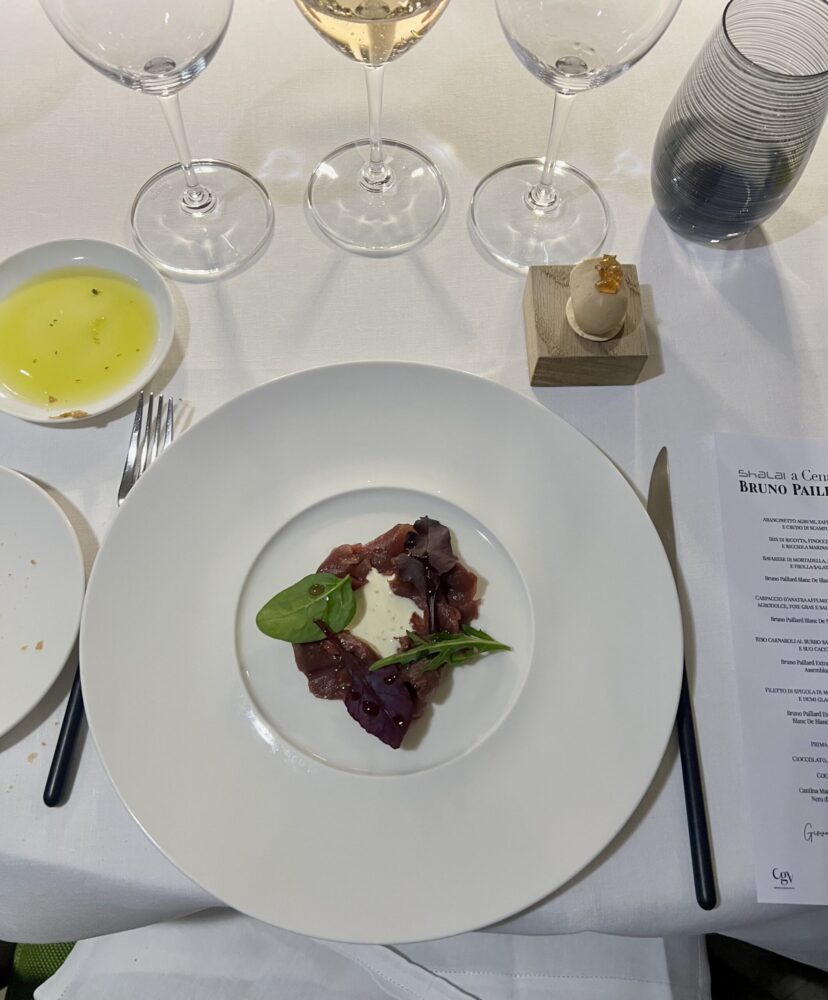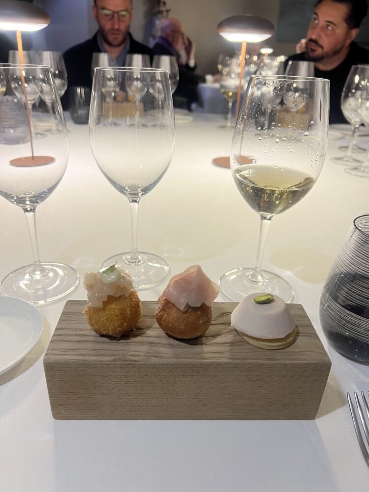 Dallo Chardonnay si passa poi al Pinot nero (sboccatura 2024). Il Grand Cru Blanc de Noirs di Bruno Paillard nasce dall’assemblaggio di uve provenienti da quattro Grand Cru: Verzenay, Mailly, Verzy e Bouzy, tre dei quali caratterizzati da una maggiore esposizione a nord. Anche in questo caso il vino effettua un passaggio tra acciaio e legno, con le stesse percentuali del Blanc de Blancs, prima di riposare tre anni sui lieviti. Il profilo è radicalmente diverso: le note di fragoline di bosco sono il primo biglietto da visita olfattivo. Al palato risulta più rotondo e si può definire a pieno titolo “gastronomico”. Richiede un piatto più strutturato degli assaggi precedenti, come il carpaccio di anatra affumicata con salsa alla senape e miele. Interessante anche il boccone di foie gras con gelée al Marsala servito in accompagnamento, sebbene la componente alcolica dell’assaggio entrasse in parziale contrasto con lo Champagne stesso.