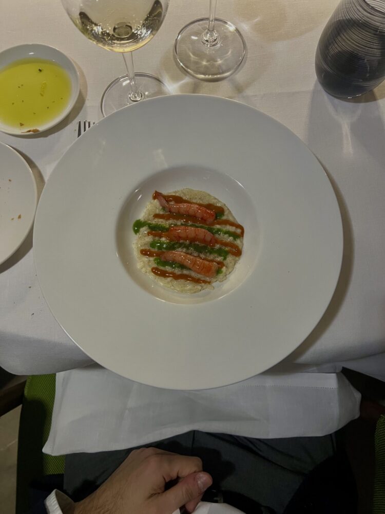 Il viaggio prosegue con l’Extra Brut Millésime Assemblage 2015. Pinot nero al 58% e Chardonnay al 42%, questo Champagne ha affinato sette anni sui lieviti e ulteriori tre anni in bottiglia. L’etichetta cambia di anno in anno; quella del 2015 porta la firma dell’artista francese Gérard Titus-Carmel. È un vino che racconta il tempo e dimostra di saperlo affrontare senza timori. Al colore dorato corrisponde un bouquet ricco di note di pasticceria, con lievi sfumature ossidative. In bocca conserva una notevole freschezza. In abbinamento, chef Santoro porta il mare tra la pietra lavica di Linguaglossa con un risotto al burro salato, gambero rosso crudo, caciucco di gambero e salsa al prezzemolo. La grassezza e la tendenza dolce del piatto trovano un buon equilibrio nel Millésime Assemblage 2015, che in evoluzione rivela anche note di spezie chiare ed erbe aromatiche. Volendo osare, si sarebbe potuto riproporre anche il Blanc de Blancs Grand Cru, la cui freschezza avrebbe creato un interessante dialogo con il carnaroli e il gambero.