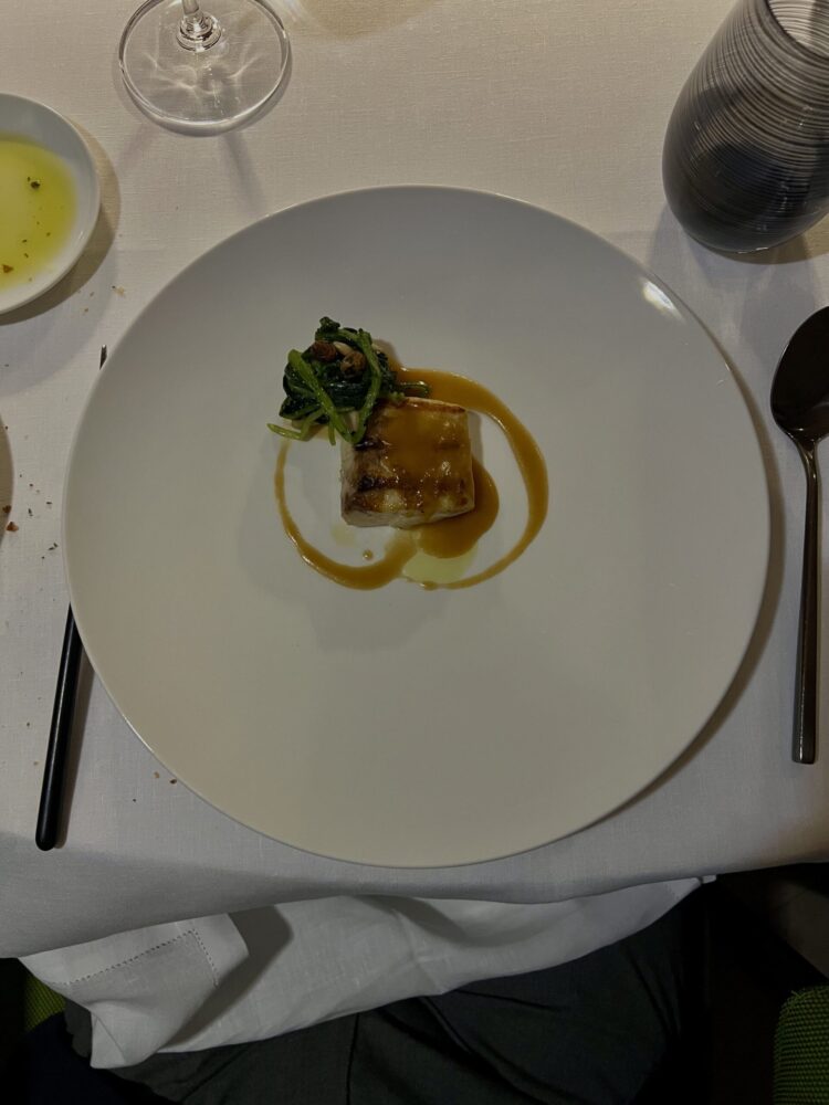 L’ultima tappa è l’Extra Brut Millésime Blanc de Blancs Grand Cru 2014, la cui etichetta reca la firma della pittrice Monique Tello. “Ogni millesimato ha una propria identità”, e in questo caso il calice offre una tensione acida ancora molto marcata. Si tratta di un Grand Cru proveniente da una delle annate migliori della Champagne (la 2014, per l’appunto), con otto anni di affinamento sui lieviti e ulteriori 16–18 mesi in bottiglia. Al sorso è pieno e dimostra grande versatilità, potendosi abbinare anche a carni bianche come pollo o coniglio. Al naso emergono inizialmente agrumi e biancospino, seguiti da note di frutta secca. Chef Santoro sceglie comunque di accompagnarlo a un filetto di spigola di mare al BBQ, con cicorietta ripassata e demi-glace di pesce: la nota fumé del piatto si armonizza efficacemente con il vino.