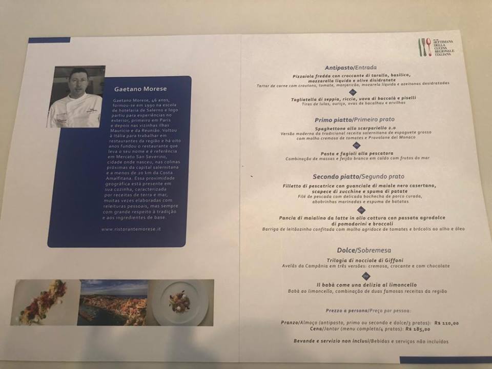 Venti chef italiani, insieme a venti chef di ristoranti italiani di San Paolo hanno preparato le loro specialità per far conoscere ai convenuti profumi e sapori d’Italia. Pancia di maialino da latte in olio cottura con passata agrodolce di pomodorini e broccoli, pasta e fagioli alla pescatora, filetto di pescatrice con guanciale di maiale nero casertano, scapece di zucchine e spuma di patate, pizzaiola fredda, spaghetto allo scarpariello 2.0, tagliatella di seppia, riccio, uova di baccalà e piselli, il babà come una delizia, declinazione alle nocciole, questi i piatti dello chef Morese che hanno visto protagonisti eccellenze campane quali i pomodori, il suino casertano, il provolone del monaco, la colatura di alici, l’olio delle colline salernitane, il limoncello, la nocciola di Giffoni.