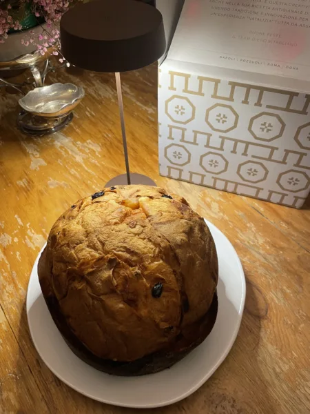 E’ confezionato in un’elegante scatola bianca con un pattern di monogrammi dorati che si ispirano alle decorazioni del Tempio di Serapide a Pozzuoli il panettone di Diego Vitagliano, il pizzaiolo napoletano che è all’apice della classifica 50 Top Pizza Italia e World 2023. Il panettone sfornato dalla pizzeria n.1 al mondo è un lievitato morbido e profumato, leggero, molto alveolato fatto con lievito madre e materie di prima qualità come le bacche di vaniglia Bourbon, uvetta australiana.