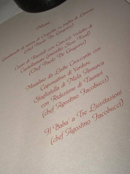 Nei piatti tutto il rispetto e l’attenzione verso le materie prime selezionate per la serata: i Gamberetti di Nassa di Crapolla, pescati a ridosso di uno dei paradisi in terra, Punta Campanella, ed il Carciofo Violetto di Castellammare entrambi presidi Slow Food tutelati dalla condotta Costiera Sorrentina e Capri che ha collaborato all’organizzazione della serata.