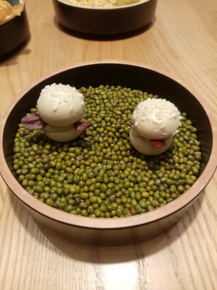 A seguire, come secondi, baccalà cotto a bassa temperatura con crema di piselli, asparagi e maionese all’aglio nero fermentato e baccalà arrostito con scarola alla napoletana.