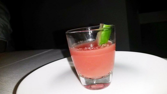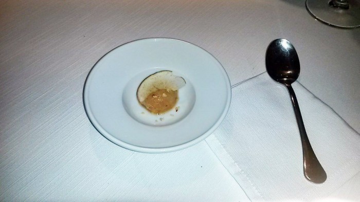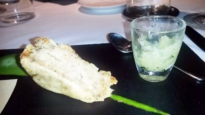 Nella mia prima visita non sono riuscito a resistere al Menu Interpretazioni da Ieri ad Oggi….e ho chiesto di inserire, nel momento in cui lo chef lo avesse ritenuto più appropriato, la Pizza in Black (dedicato a Davide Scabin) e la ruffiana caprese di fragole e baccalà.