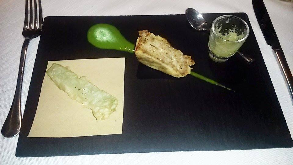 Di secondo una Tagliata non tagliata di vitello degli Alburni su brace di erbe aromatiche, riduzione di aglianico e patata cotta sotto cenere. Anche questo piatto, semplice a vedersi e difficile a prepararsi, mostra la completa conoscenza delle materie prime (lunga frollatura) e piena padronanza nel loro trattamento.