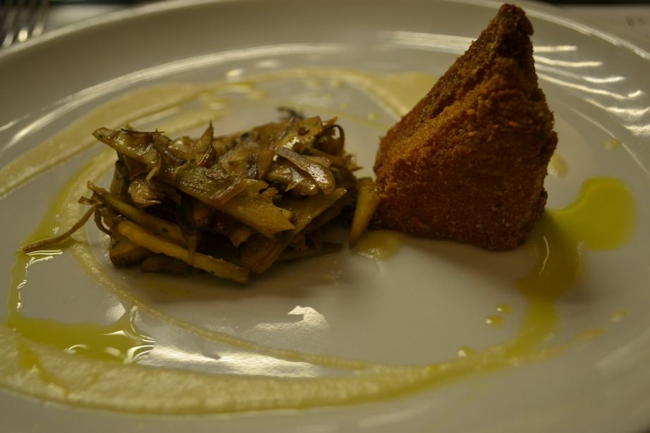 L’antipasto è un connubio riuscito tra il croccante ben dorato del caciofiore e il sapore deciso del carciofo crudo, esaltati da sentori di amaro e di piccante dell’olio extravergine Bon Riposo (Az. Agricola l’Isoletta ad Aprilia).