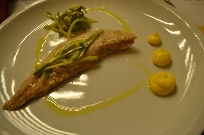 Originale il tipo di cottura scelta per valorizzare il maccarello, sottovuoto e a bassa temperatura, per mantenere la carne del pesce morbida e succulenta. In contrasto l’acida della zucchina escabeche, il tutto accompagnato da una maionese delicata, simile ad una mousse, all’olio extravergine d’oliva reatino Olio del Podere (Chiusa della Vasca di Farfa).