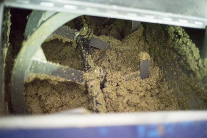 Dopo circa 30 minuti di gramolatura, la pasta passa in un separatore orizzontale centrifugo che separa la parte solida, o sansa, composta dalle buccette, dai residui della polpa e dai frammenti di nocciolo, dalla parte liquida, composta da acqua di vegetazione ed olio.