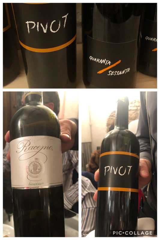 Della collezione Design il ” Bombino” composto dall’omonimo vitigno in purezza è un vino che diventa quasi aromatico fatto di una sapidità particolare che ricorda la salamoia delle olive proposto con Tataki di fassona, fragole, zucchine e gelato di parmigiano antipasto pienamente primaverile dai toni fruttati e dolci è un connubio ben riuscito. Della collezione classica il” Racemo” Bio Bianco 2017 ( Malvasia Puntinata 50%- Malvasia di Candia20%- Bellone 20% e Grechetto10%) 13% vol. ha note erbacee e linfatiche, bocca minerale e finale ammandorlato, un Frascati agile nel sorso che si accosta sorprendentemente alla pizza alla carbonara e fior di latte vacche rosse. Sempre della collezione Design il Quaranta/Sessanta ( Shiraz 40% e Cesanese 60%) IGT Lazio Rosso 13,5 % vol. porta al naso freschezza fruttata di fragola e ciliegia e spezie pungenti che si armonizzano con la ricchezza saporita della coda alla vaccinara adagiata su una pizza morbida e croccante senza unto e senza risultare molliccia. ” Pivot ” 2015( 60% Cesanese – 20% Merlot- 20% Cabernet Sauvignon) 15%vol. fatto con il metodo del ripasso ha un timbro internazionale. E’ un vino austero che ha bisogno di un maggiore affinamento per amalgamare le sue componenti. Avvolge naso e palato con alloro e spezie,liquerizia e polvere di cacao; regge l’accostamento con la quaglia e salsa al blu di bufala senza creare scie amare in bocca ma non convince pienamente. Il sorbetto menta e piselli con piccola macedonia di frutta e verdura è un piccolo capolavoro di Roberto Campitelli per rinfrescare il palato alla fine del pasto mentre la pastiera di Edoardo Papa è un dessert rivisitato e corretto di un grande classico della pasticceria napoletana.