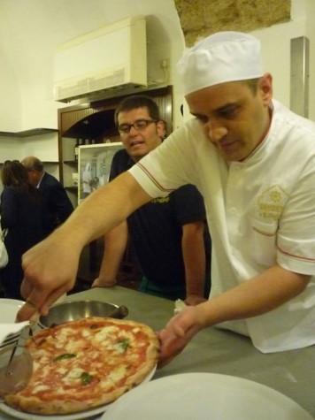 I “Loro”, sono Giuseppe e Antonio Furfaro, Angelo e Gianpaolo Greco, volti noti di Trianon, altra storica pizzeria di Via Pietro Colletta. E’stata festa grande ieri sera, con brindisi, pizze in uscita a ripetizione dal forno, mozzarella e provola a go go dispensata con generosità dall’incappucciato casarosofo (casaro filosofo di Capodrise, Caserta) Antonio Farina vestito da monaco benedettino e perfino la presentazione di un libro. Una celebrazione familiare e tra amici dove incontro, come esterni, i soli Luigi Ciccarelli, collega giornalista, e Pino Mandarano, fiduciario Slow Food di Napoli.
