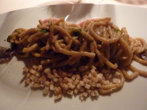 Vale la pena soffermarsi sul pane, in genere un po’ trascurato nelle recensioni eppure fondamentale, anche in considerazione del fatto che in genere è la cosa che più si mangia. Abbiamo ammirato l’ottima tecnica di lievitazione, come del resto potrete vedere anche dalla foto.