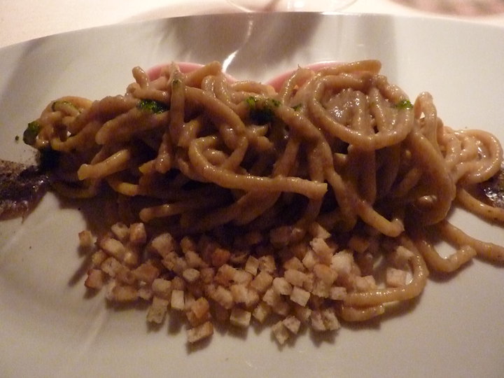 Ma, poiché la vita continua, procediamo con alcune estrapolazioni dal menu vegetale: un’estetica rosa di rapa, kefir di capra, liquirizia e arachidi e le Casarecce integrali “Fracasso” (piccolo pastificio locale) con Fagioli di Lamon e Olio “Le Marsicane” di intrigante persistenza, prima di pescare a piene mani nella parte più selvatica e intensa del menu di terra.
