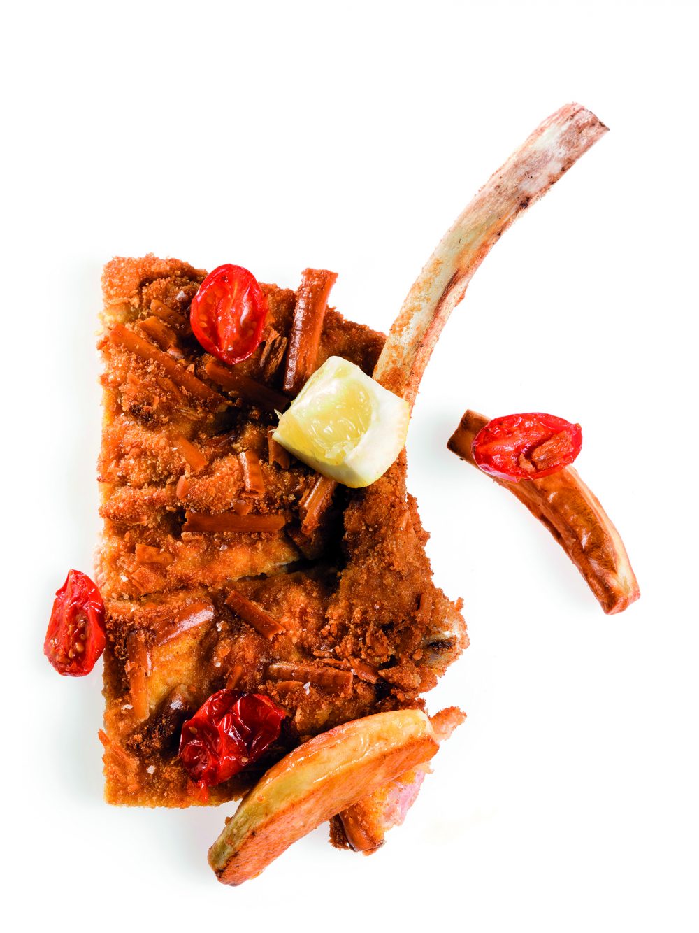 La costoletta manterrà la versione originale, impanata con pane e grissini per rendere particolarmente croccante lo scrigno esterno e mantenerne tenero e morbidissimo l’interno e servita con patate al forno e pomodorini di Pachino appena scottati.