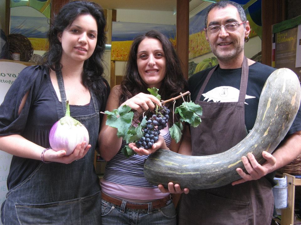 Mariagrazie Sauchelli, Marialuisa Squitieri e Oscar Perrone con melanzana tonda, uva palombella e zucca lunga di Napoli