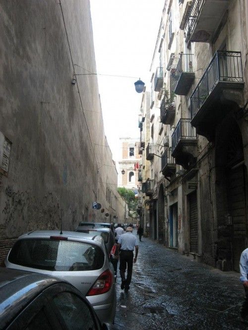 In genere siamo abituati ad avere una visione frontale sulla meravigliosa facciata di tufo giallo. Lungo il vicolo c’è anche la vecchia farmacia, più su una cioccolateria Gay Odin ed un po’ oltre c’è la storica pizzeria Lombardi. Sulla sommità del vicolo risalta lo splendido torrione del campanile di Santa Chiara in stile gotico. E’ un luogo questo dove non ci si può recare se si ha fretta. Sono troppi i punti di interesse che stuzzicheranno la curiosità ed il palato.