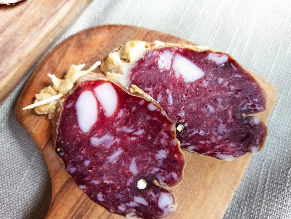 -La Ricotta è quella fatto con il latte delle Pecore Malvizze, una razza autoctona che pascola a Bagnoli Irpino; -La carrellata di taglieri di salumi della propria produzione artigianale è rappresentata da: -Prosciutto crudo essiccato in vinacce per dare aroma e per adeguarsi al clima di Montoro per la stagionatura (Raffaele ci dice che oltre alle sue produzioni, l’unico salume “importato” è quello friulano di San Daniele, dove si reca periodicamente per la scelta dei Porci dai quali ricaveranno i suoi prosciutti); -Il Filetto, il Capocollo e il Guanciale di media stagionatura; -Il Culatello e il Capocollo di stagionature più lunghe; -La Soppressata e la rara Tracchiulella stagionata; I Crostini con il lardo affumicato e la Parmiggiana di Verza.