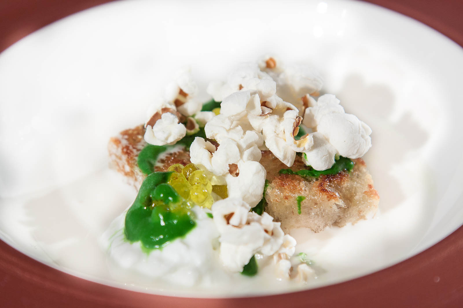Iacobucci la schiaccia con le mani fino a ricavarne tutto il liquido, in cui mette in infusione del fieno a 35 gradi (punto di cagliata della mozzarella, per rispettare la tradizione dei casari e non alterarne sapore e struttura). Il liquido intenso e profumato fa da base a dei crostini di pane, caviale d’olio extravergine d’oliva e pop corn: un omaggio ai suoi ricordi d’infanzia ma anche alla cultura latina da cui viene Mauro, con il mais soffiato.