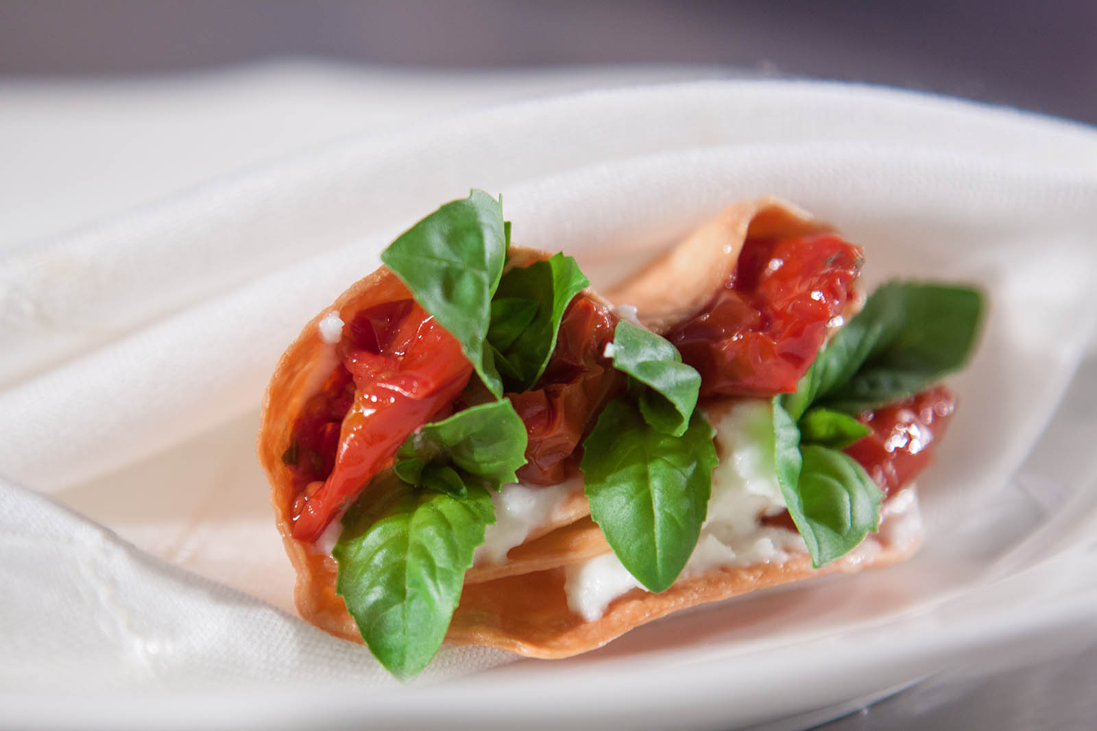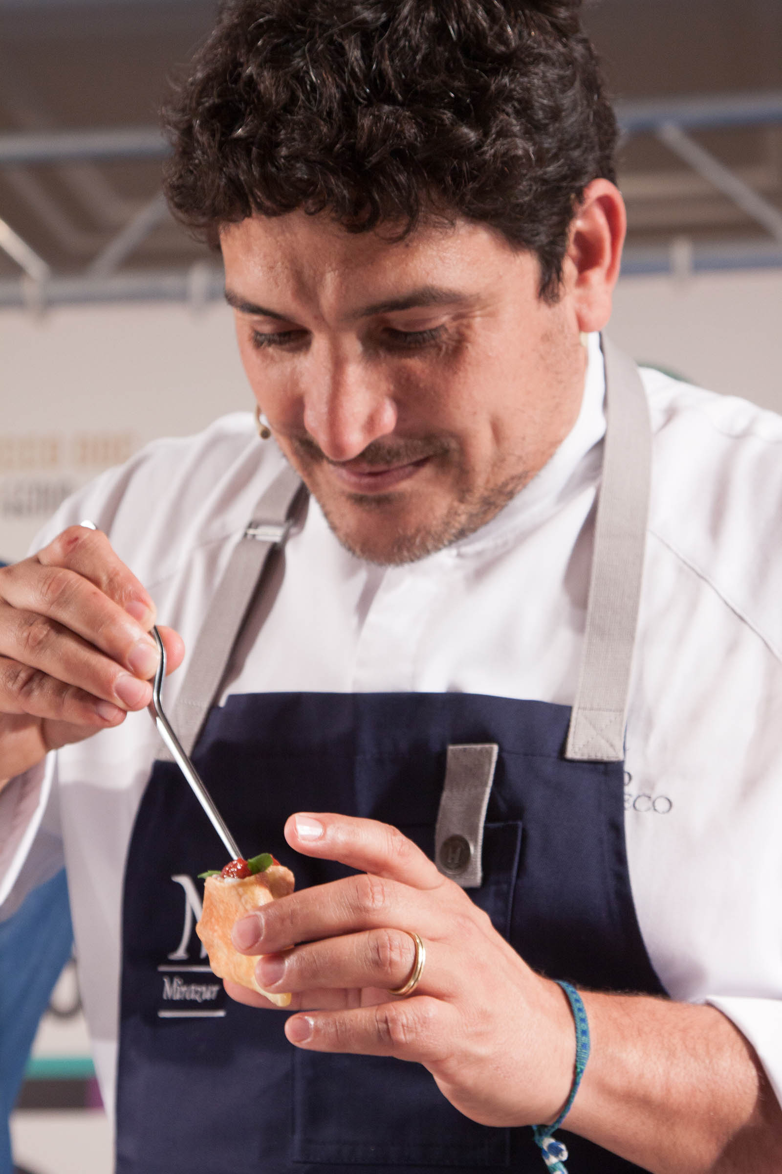 Colagreco prende invece usa polpa della mozzarella per fare un “impasto” sottile e super-croccante che cuoce nello stampo per le tortillas messicane. Ne ricava un taco che farcisce con stacciata di bufala condita con olio extravergine e sale, pomodorini – in questo caso quelli campani, mentre al Mirazur usa quelli del suo orto – e basilico fresco, da mangiare rigorosamente con le mani.