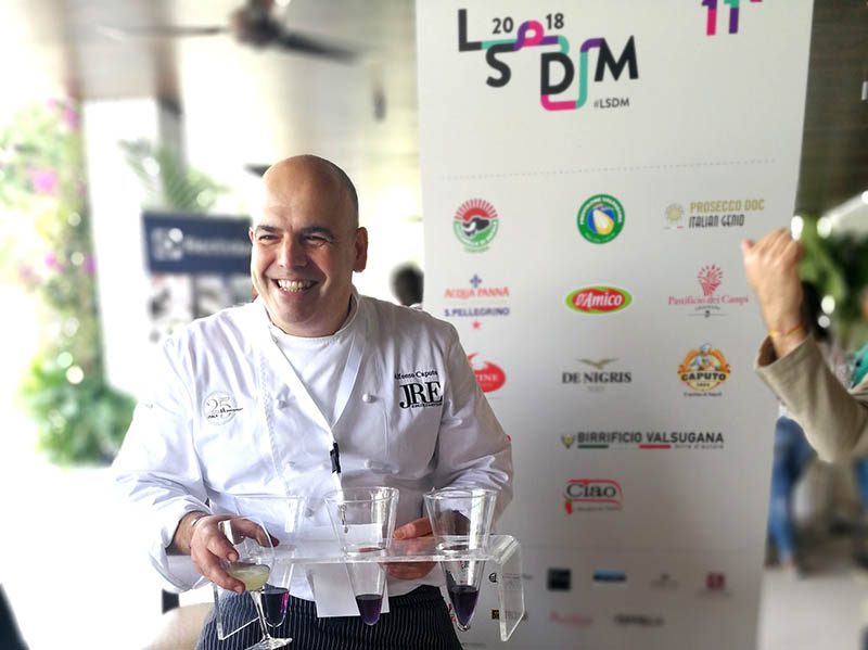 Così ad LSDM 2018 Alfonso Caputo ha presentato una “Triglia cruda con moka di ricci di mare, brodo di cavolo nero e pomodoro secco D’Amico”.