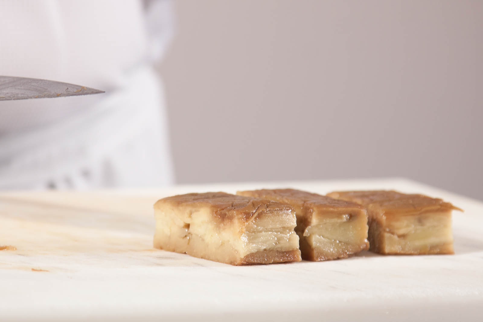 Tra le sue esperienze, però, ci sono anche tanti anni all’estero, da Jakarta a Shanghai. Da quest’ultima – in particolare, dall’assaggio di una ricetta a base di maiale, melanzane e spezie, buona ma molto grassa e poco elegante – nasce il piatto presentato al congresso nelle tre differenti versioni che ne hanno segnato l’evoluzione. Al centro resta la melanzana, pelata e fritta tutta intera, poi glassata più volte con una salsa a base di succo di melanzana e salsa di soia e schiacciata fino a concentrarne il sapore. Angelo ne ottiene un parallelepipedo compatto, saporito e per nulla unto, che poi taglia in piccoli rettangoli da guarnire quasi come se fossero dei raffinati dolci monoporzione.