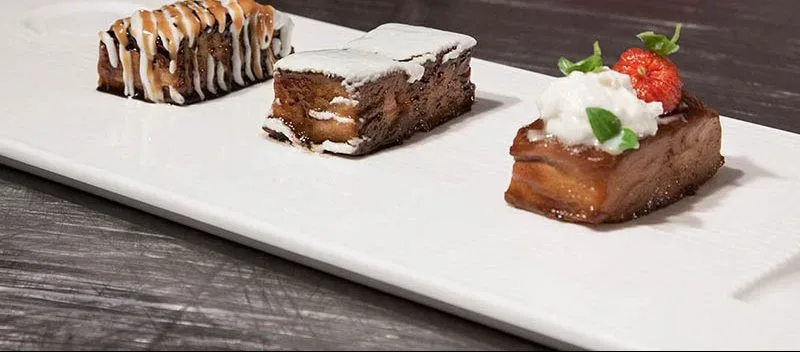 Tra le sue esperienze, però, ci sono anche tanti anni all’estero, da Jakarta a Shanghai. Da quest’ultima – in particolare, dall’assaggio di una ricetta a base di maiale, melanzane e spezie, buona ma molto grassa e poco elegante – nasce il piatto presentato al congresso nelle tre differenti versioni che ne hanno segnato l’evoluzione. Al centro resta la melanzana, pelata e fritta tutta intera, poi glassata più volte con una salsa a base di succo di melanzana e salsa di soia e schiacciata fino a concentrarne il sapore. Angelo ne ottiene un parallelepipedo compatto, saporito e per nulla unto, che poi taglia in piccoli rettangoli da guarnire quasi come se fossero dei raffinati dolci monoporzione.