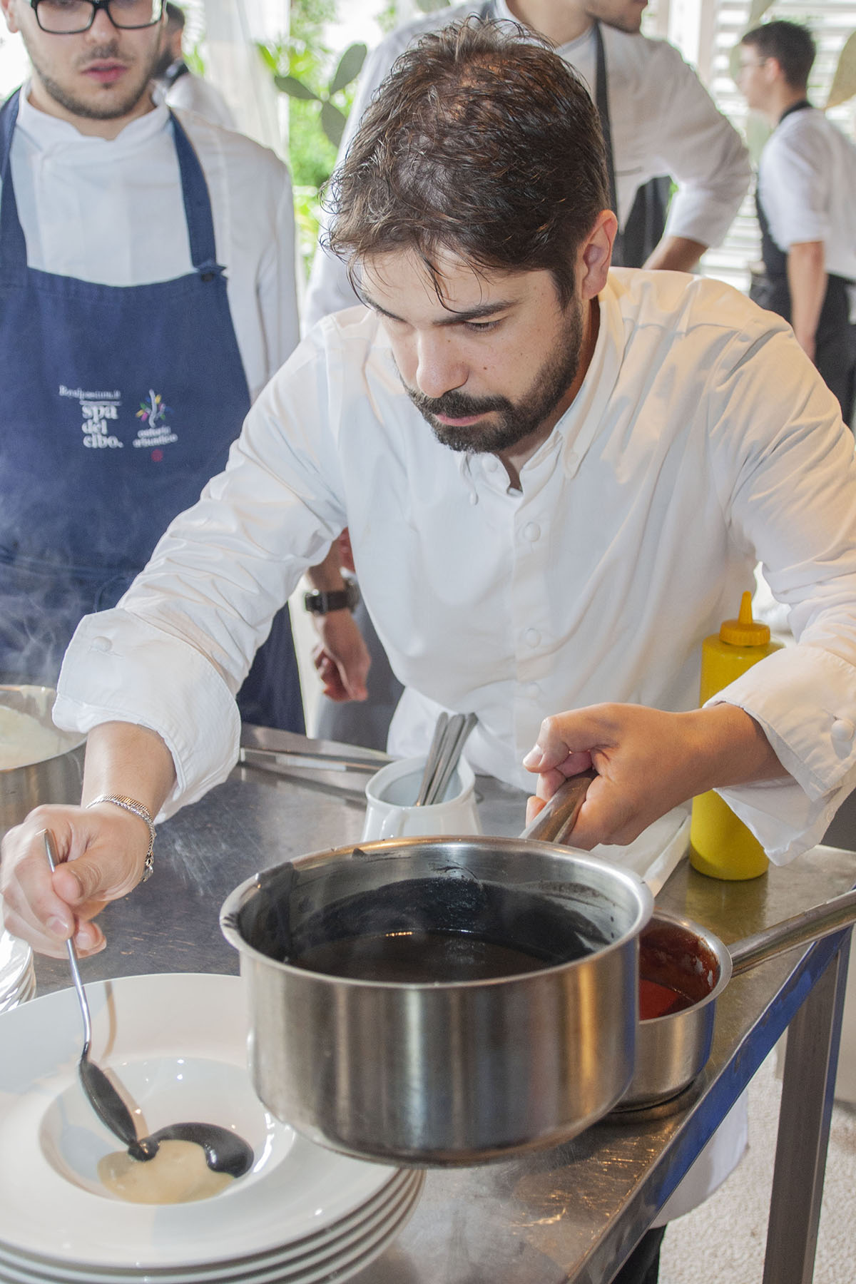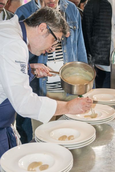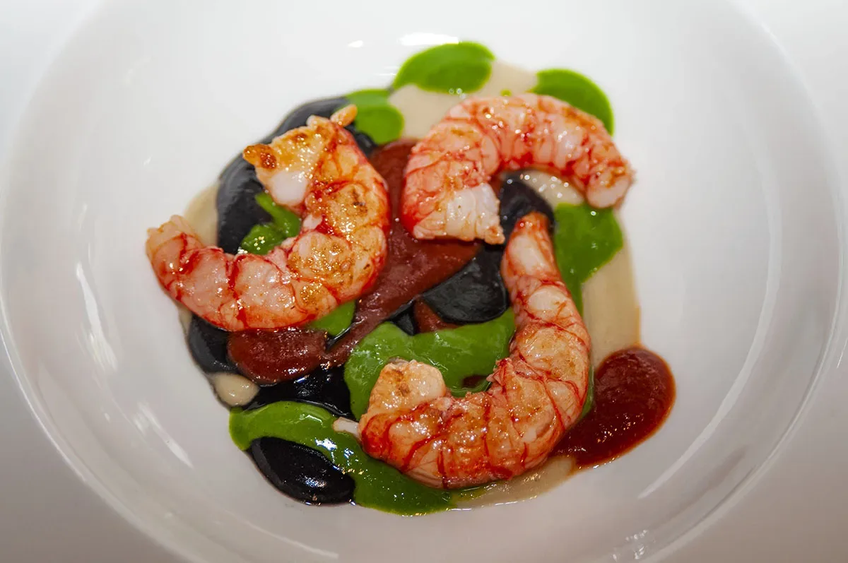 Il suo piatto per LSDM è “ceci e gamberi”: crema di sedano, crema di ceci bianchi, crema di ceci neri, bisque di gamberi e gamberi saltati.
