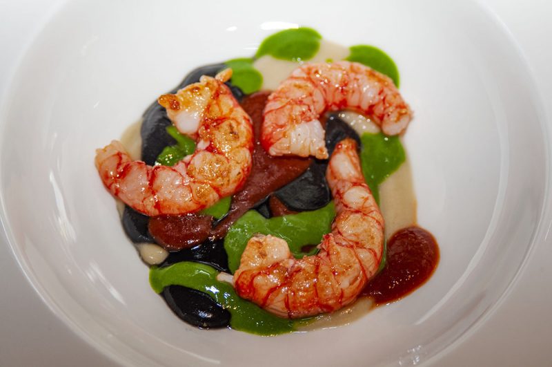 Il suo piatto è un gioco cromatico: c’è il verde, con una crema vegetale a base di sedano e prezzemolo, il nero dell’aglio ed i ceci e spicca poi l’accenno di rosso per richiamare l’ingrediente nobile, il gambero rosso, estremamente fresco. La bisque di gamberi per il fondo, vivacizza la portata ed è ottenuta con agrumi e finocchi. La consistenza è nel corpo del crostaceo, cotto in padella e nella chips fritta ottenuta con riso stracotto e bisque. Estremamente delicato, semplice ed equilibrato, nel piatto i sapori si riconoscono. Il legume dona cremosità, il gambero la sua parte marina mentre la chips la consistenza.