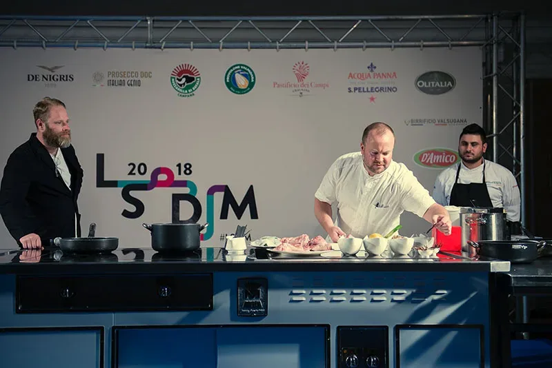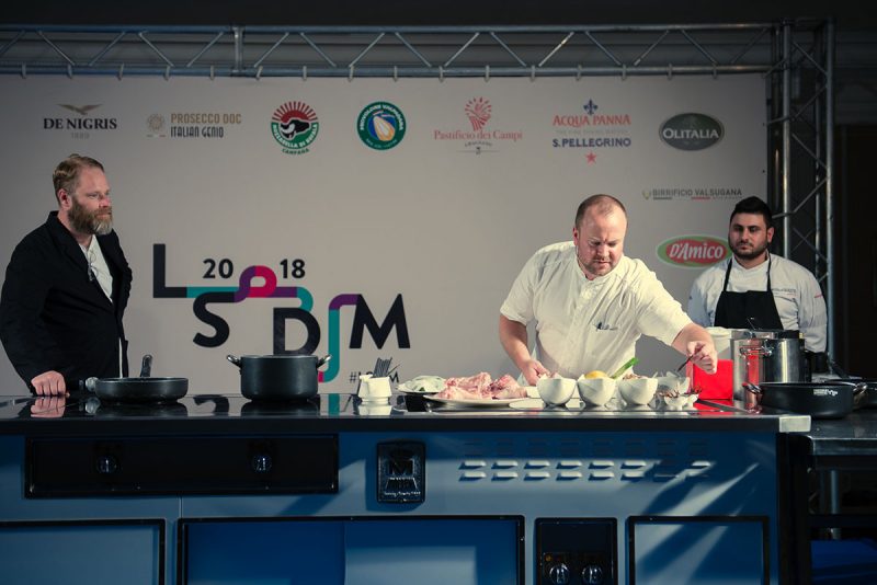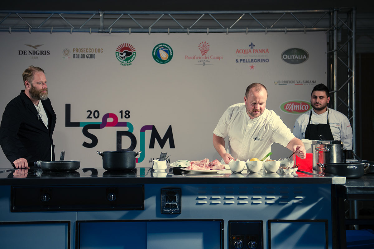 Daniel Berlin, arrivato dal sud della Svezia, e più esattamente dal villaggio di Skåne Tranås, e moderato nel suo intervento a LSDM 2018 da Mattias Kroon, entra subito nel vivo del tema del congresso: “Eat well, stay well” per lui vuol dire nessuno spreco e imparare a utilizzare e a cucinare l’intero animale. Daniel è.cacciatore da anni e porta avanti questa filosofia con convinzione nel suo Daniel Berlin Krog, due stelle Michelin, mentre osserva con un po’ di disappunto molti suoi colleghi che spendono tanto per comprare una materia prima di cui poi gettano buona parte.