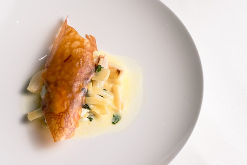 Nel frattempo frullando la lingua di anatra selvatica e la pelle del gallo insieme all’amido risultante dalla cottura della pasta, ottiene un composto che, steso sul silpat e seccato, sembrerà una sorta di nuova pelle e fungerà da chips a completamento del piatto.