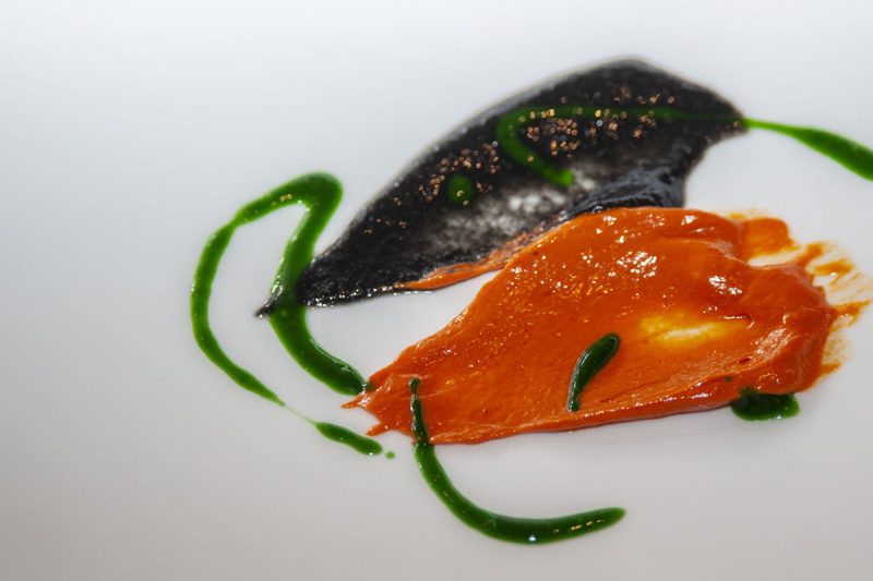 Fra i formati di pasta a volte dimenticati, qui il fusillo di pasta si presenta con semplicità in una salsa di nduja per una piccantezza delicata e una crema di patata acidula con nero di seppia ed estratto di bergamotto. A completare il piatto c’è il ragù tradizionale di pesce mentre il verde, che colora il piatto, viene dall’emulsione di prezzemolo.