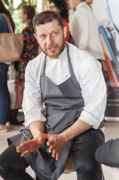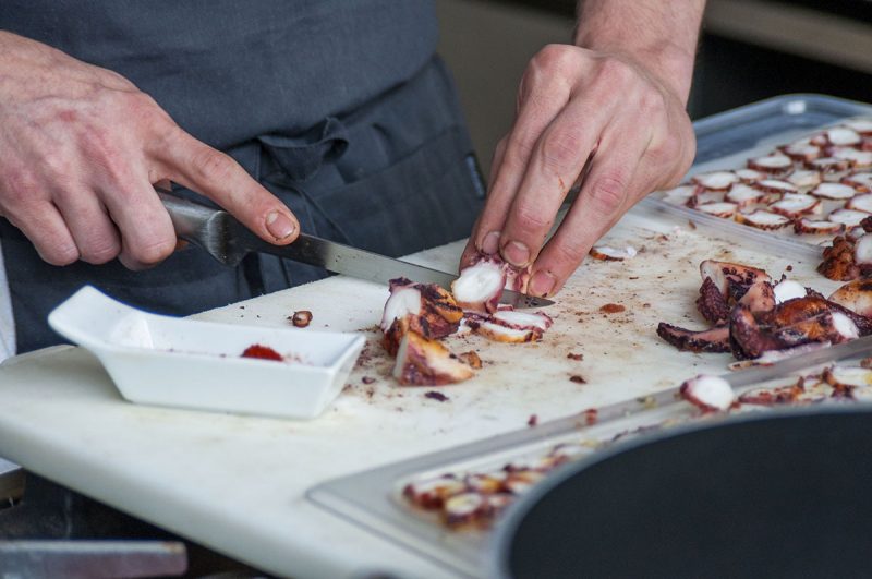 “Siamo in Italia e da grande amante della pasta ho pensato ad un bottone, un raviolo con polpa di pomodoro, ottenuta con crioestrazione. L’acqua del pomodoro mi servirà per cuocere il raviolo ma per comporre il piatto ho pensato al polpo, ispirandomi alla cucina galiziana. Il polpo è cotto a pressione in pochissima acqua e a sostituzione della paprika, ho utilizzato la buccia del pomodoro, il peperoncino e il peperone arrosto, che ho affumicato con gli stessi grappoli del pomodoro. Dove c’è peperone, ci deve essere l’acciuga, per questo, anche valorizzando i prodotti del territorio, ho inserito anche qualche goccia di colatura di alici.”