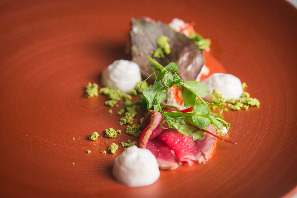Si parte dal controfiletto di bufala da allevamento e alimentazione non intensivi, una carne ricca di zinco e vitamina B6 e B12, lasciata a marinae per 24 ore nello yogurt di bufala e aromi, per passare poi qualche tempo in una seconda marinatura a base di sale e peperoncino d’Espelette. Scottata quindi sulla griglia a 300 gradi, si sigilla subito conservando grasso e succhi che la renderanno saporita. In fettine sottilissime andrà poi ad accompagnarsi nella creazione dello chef a una conserva di pomodori (frullati e passati al colino, cotti successivamente in vasocottura nel forno a vapore per circa due ore), a una ricotta di bufala affumicata, al grasso della bufala addensato con cipolla e mela e a una salsa fermentata a base di ceci ed erbe.