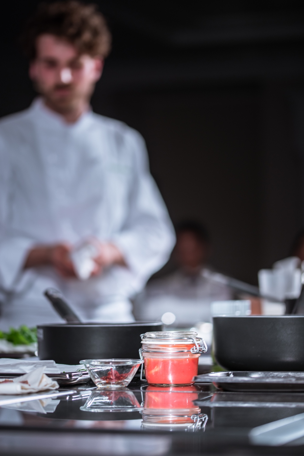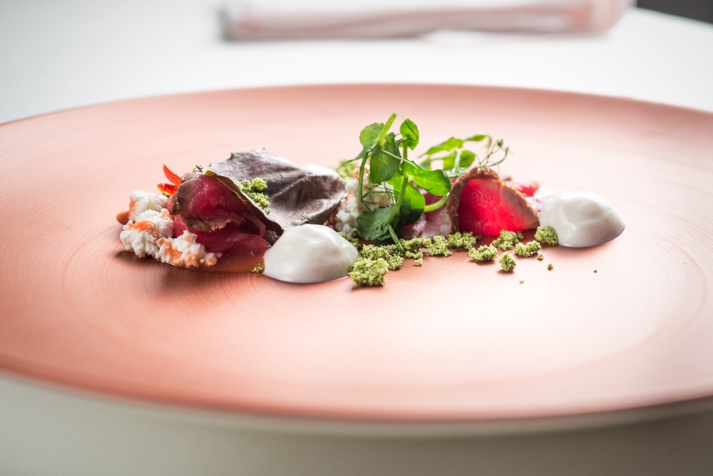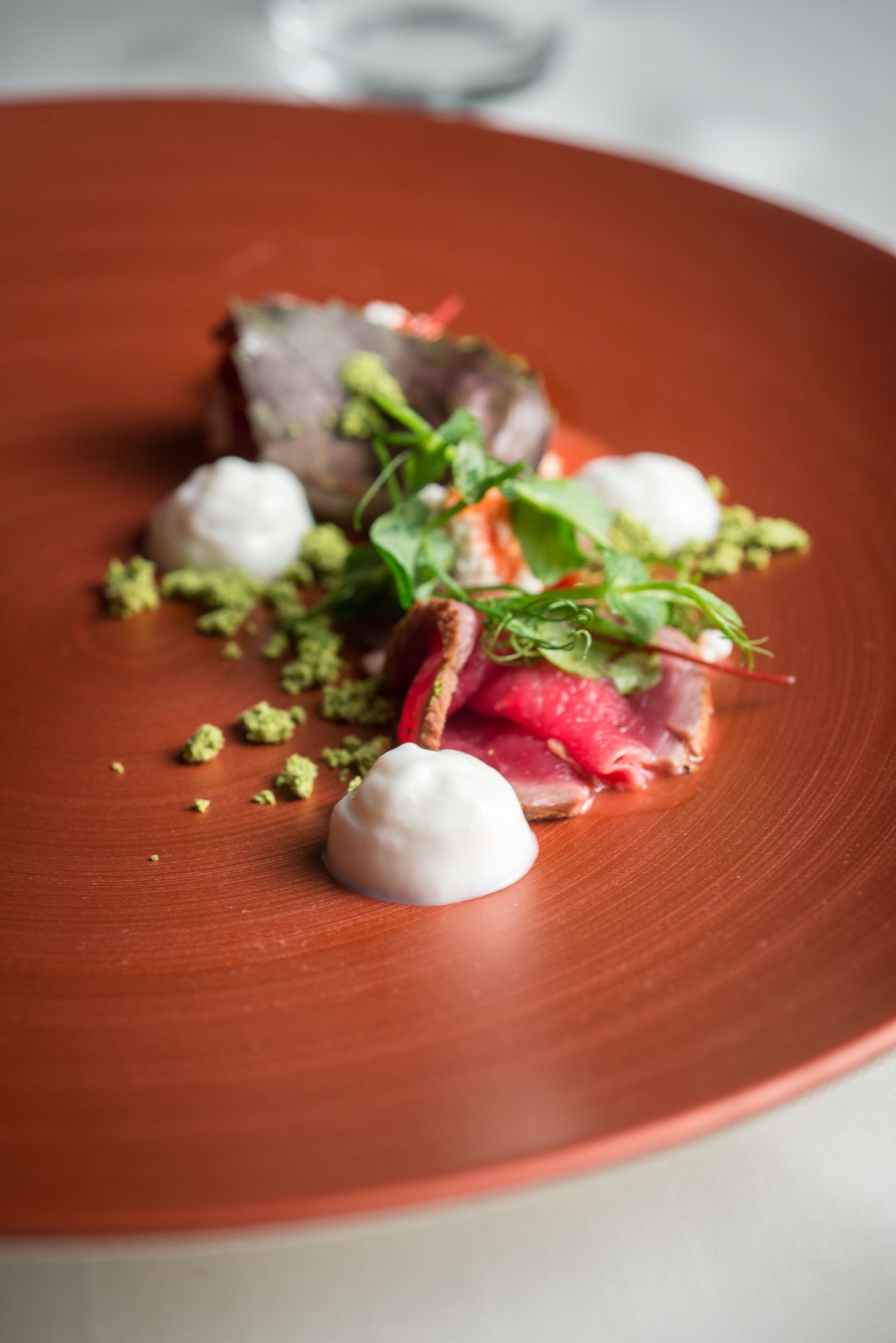 Si parte dal controfiletto di bufala da allevamento e alimentazione non intensivi, una carne ricca di zinco e vitamina B6 e B12, lasciata a marinae per 24 ore nello yogurt di bufala e aromi, per passare poi qualche tempo in una seconda marinatura a base di sale e peperoncino d’Espelette. Scottata quindi sulla griglia a 300 gradi, si sigilla subito conservando grasso e succhi che la renderanno saporita. In fettine sottilissime andrà poi ad accompagnarsi nella creazione dello chef a una conserva di pomodori (frullati e passati al colino, cotti successivamente in vasocottura nel forno a vapore per circa due ore), a una ricotta di bufala affumicata, al grasso della bufala addensato con cipolla e mela e a una salsa fermentata a base di ceci ed erbe.