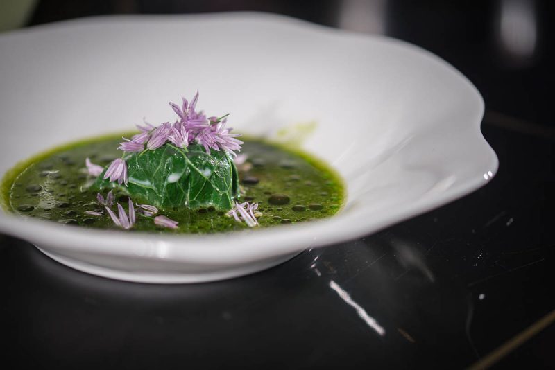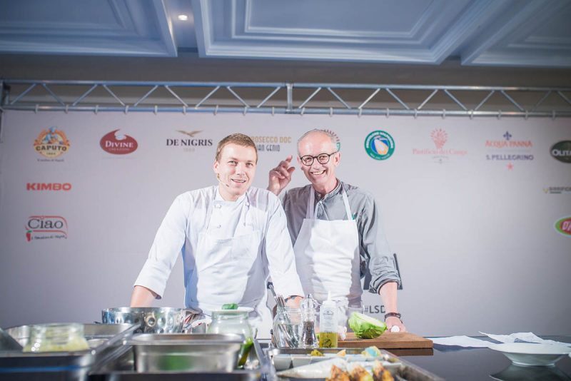 I Rachinger, che raccontano di tenere in carta per scelta sia grandi classici della tradizione che piatti innovativi, hanno lavorato con grande concentrazione, interpellati e sollecitati da uno spumeggiante Mattias Kroon. Di poche parole ma capaci di intendersi al volo con uno sguardo durante le lunghe e complesse preparazioni, si sono cimentati in ben tre piatti: il primo a base di rafano fresco del loro giardino (di cui utilizzano tutto, comprese le foglie e i fiori), acqua di pomodoro, erba cipollina e burrata di bufala; il secondo che ha visto invece protagonista il cavolo verza impreziosito dalla ricotta di bufala e siero di mozzarella, dalle acciughe, dai capperi e dai fiori di sambuco.