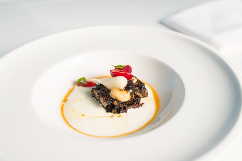 Ma la vera e propria folgorazione gustativa si è avuta con la terza e ultima proposta, uno dei signature dish del Mühltalhof, presentato per rendere omaggio alla mozzarella di bufala campana: un Black Pudding, prodotto, come tradizione vuole, con sangue e grasso di maiale a cui si aggiungono le interiora, il tutto cotto in forno e poi servito a fettine dopo essere stato passato alcuni minuti sulla piastra. Il Black Pudding è stato quindi completato con ciliegie, cumino dei prati, aglio fresco cotto nella vaniglia, aglio nero e una spuma composta in parti uguali di mozzarella e formaggio delle montagne austriache. Sapori decisi e stagionali, sapientemente abbinati per contrasto e affinità, che rendono questo grande classico un piatto della cui bontà meravigliarsi e rimeravigliarsi, un boccone dopo l’altro. Da bis!