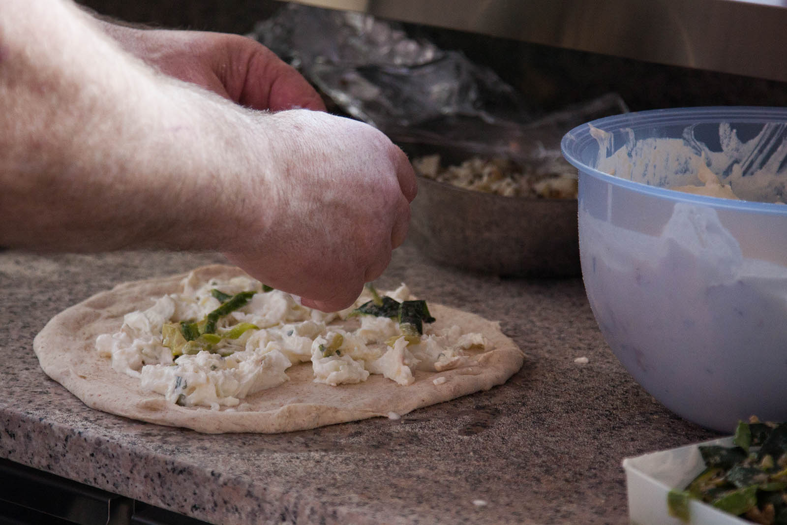 Lui è venuto la prima volta in Italia a 33 anni, ha conosciuto la nostra terra e la nostra cucina e ne è rimasto folgorato: “Se mi chiedono quale sia la mia patria rispondo: sangue russo, piedi americani ma cuore italiano”. Poi è tornato a 50 anni per imparare a fare la pizza, a Napoli naturalmente. “Da Enzo Coccia ho capito che non puoi imparare in pochi mesi, ci vuole una vita intera”. Lui sono 13 anni che lavora come pizzaiolo e ha imparato piuttosto bene, come dimostra l’assaggio proposto al congresso, l’avvolgente Pizza Blu: impasto a base di farina Blu Caputo più un 20% di Cuor di Cereali, condito con cipolle caramellate, funghi, noci, fiordilatte misto bufala e un formaggio toscano affinato nelle bacche di mirto, quasi un erborinato (blue cheese, in Inglese) ma dal gusto non troppo invadente. Fresca ed estiva invece la pizza di Caporuscio, con impasto “scuro” (a base di farina tipo 1) condito con stracciatella di mozzarella di bufala tradizionale e affumicata in infusione di limone e menta e zucchine saltate con acciughe. Decisamente mediterranea.