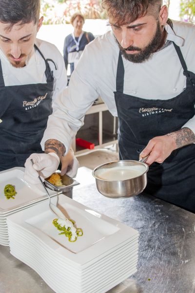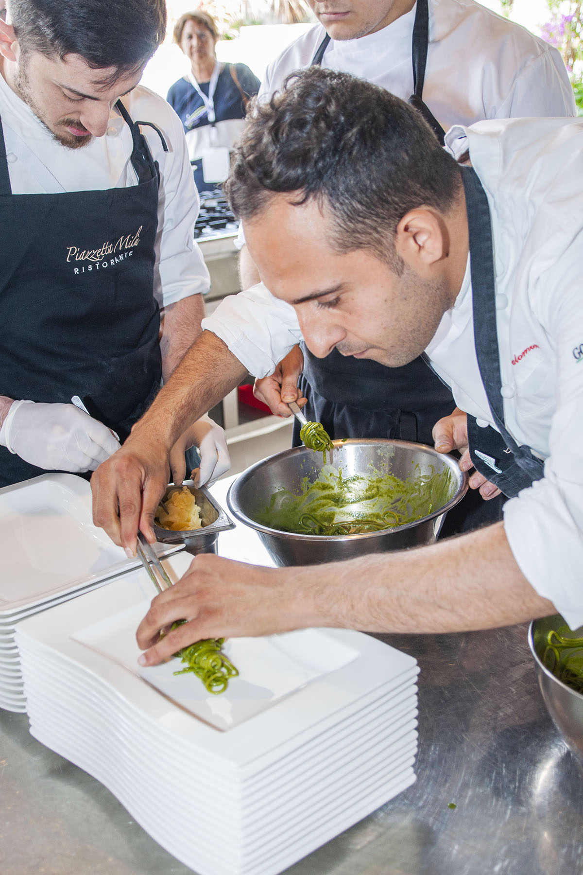 “Con De Nigris si mi sono ritrovato a puntare sull’acidità, difficile abbinamento, specialmente se parliamo di un primo piatto. Passeggiando per i vicoli, dopo un giorno di pioggia, ho visto una pianta di alloro ed è da questa che mi son fatto ispirare.” – racconta Luigi Salomone, con una piena consapevolezza del suo piatto.