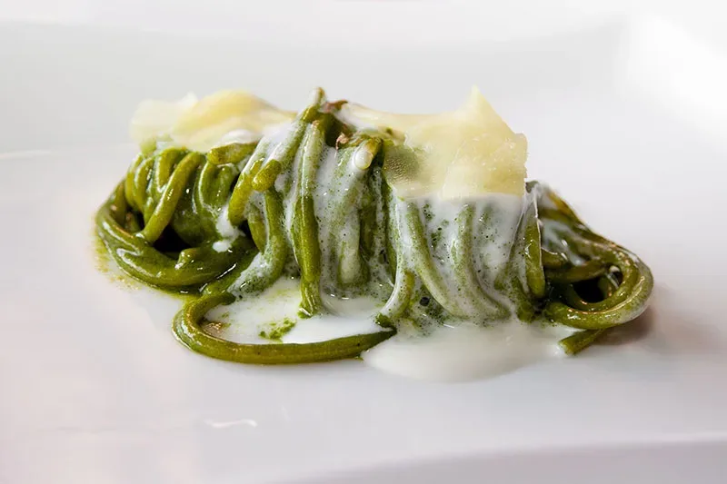Il suo è uno spaghetto tiepido con succo di alloro, zenzero marinato e mozzarella.