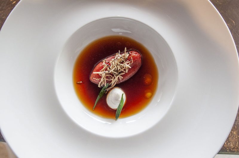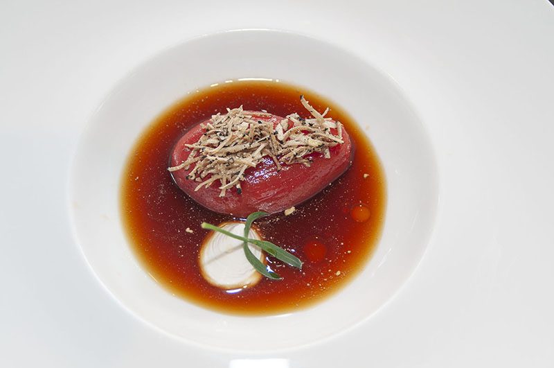Il S.Marzano, utilizzato intero, viene asciugato per una settimana in ambiente fresco ed umido, passato poi in salamoia e quindi fermentato. Il tartufo invece viene utilizzato fresco ed in olio mentre il limone viene ha un approccio asiatico, con lattuga di mare e soia, capace di donare una componente di umami. A collegare le preparazioni, la mandorla, un prodotto del Sud che fa da “ponte”.