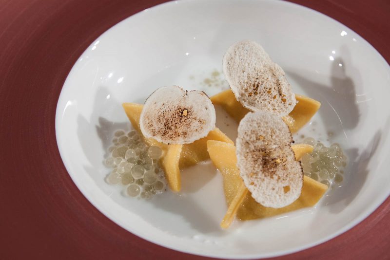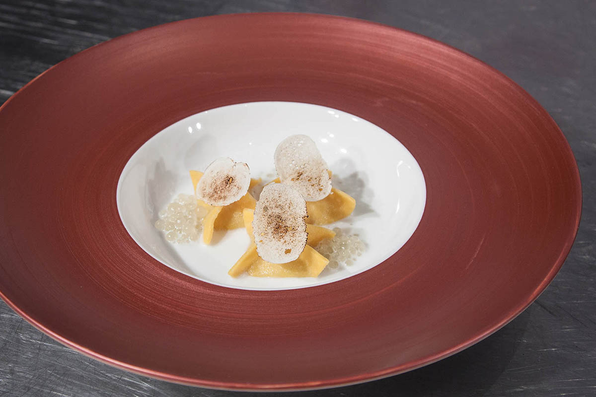 La valutazione dell’extravergine da parte di assaggiatori esperti prevede, infatti, l’analisi sensoriale a una temperatura di 28º, intervallando ogni campione con una fetta di mela verde per pulire il palato, a volte sostituita da pane o yogurt. Così, Deleo mette l’olio – un monovarietale di Caiazzana, dalla provincia di Caserta, con amaro e piccante presenti ma non invadenti – dentro a una sottile sfoglia all’uovo classica, emulsionandolo con acqua e agar agar in modo che, con la veloce cottura dei fagottini, torni allo stato liquido. Sul fondo del piatto mette del “latte” di mozzarella ottenuto semplicemente strizzandola, e completa con croccanti chips di pane tostato e un caviale di mela verde sferificata che riporta la freschezza del frutto, come avviene nel panel.